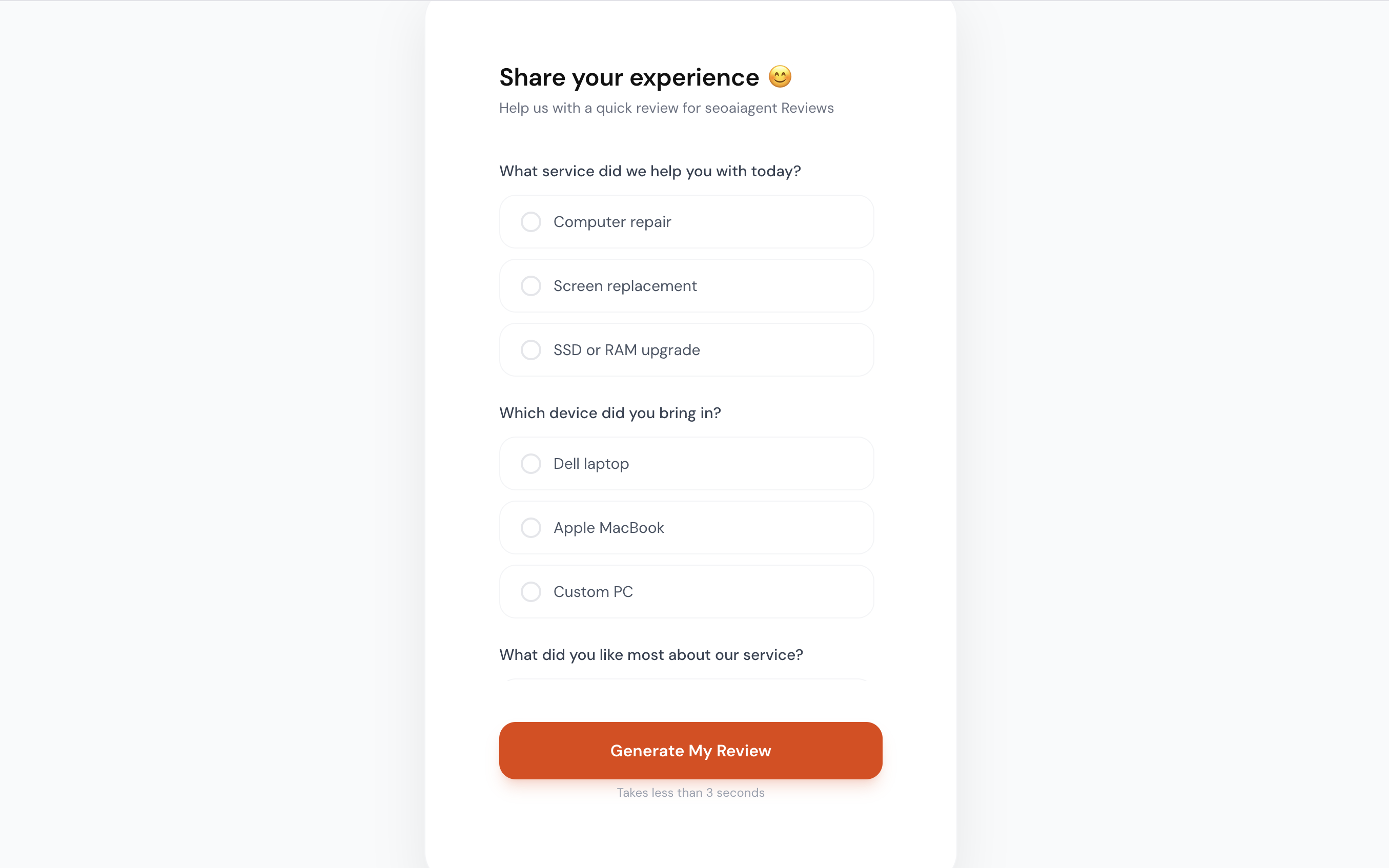 Your customers want to leave reviews but don't know what to write. AI agents guide them in 10 seconds and turn every review into SEO gold.
